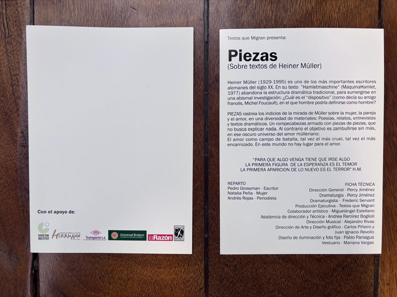 PIEZAS rastrea los indicios de la mirada de Müller sobre la mujer, la pareja y el amor, en una diversidad de materiales: Poesías, relatos, entrevistas y textos dramáticos. Un rompecabezas armado con piezas de piezas, que no busca explicar nada. Al contrario el objetivo es zambullirse sin más, en ese oscuro universo del amor mülleriano: